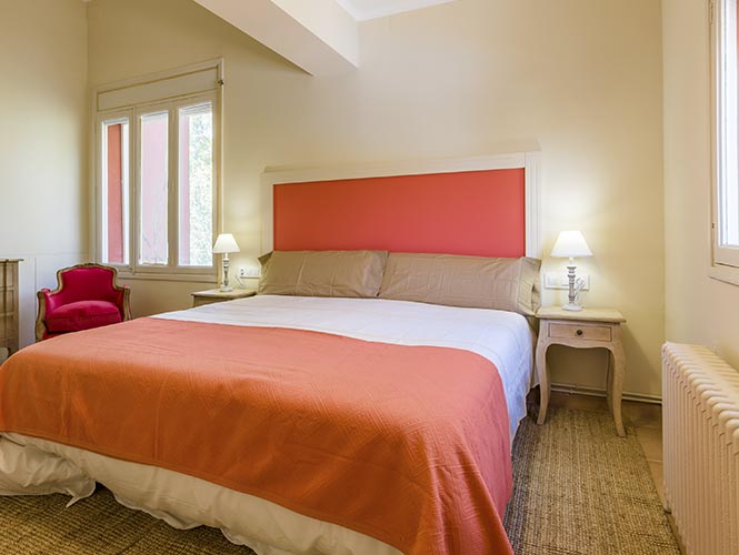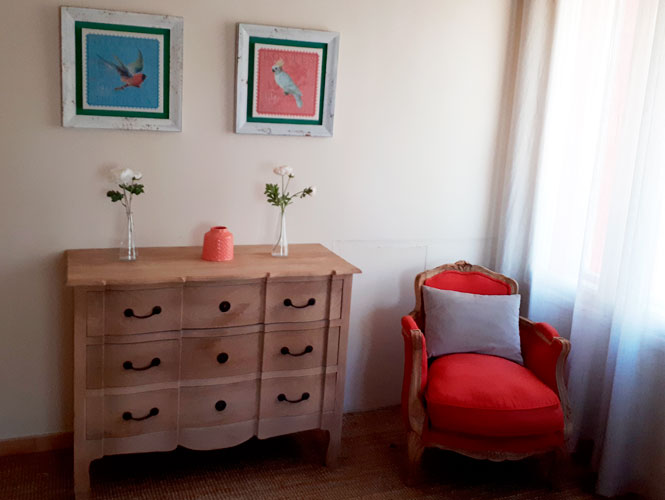 Perfecta para descansar y relajarte. Situada en la segunda planta de la casa, la habitación Coral consta de dos camas de 90 cm unidas, haciendo una cama de 1,80 cm. También se pueden poner separadas. Con aire acondicionado/calefacción. Techos altos y suelos de plaqueta.